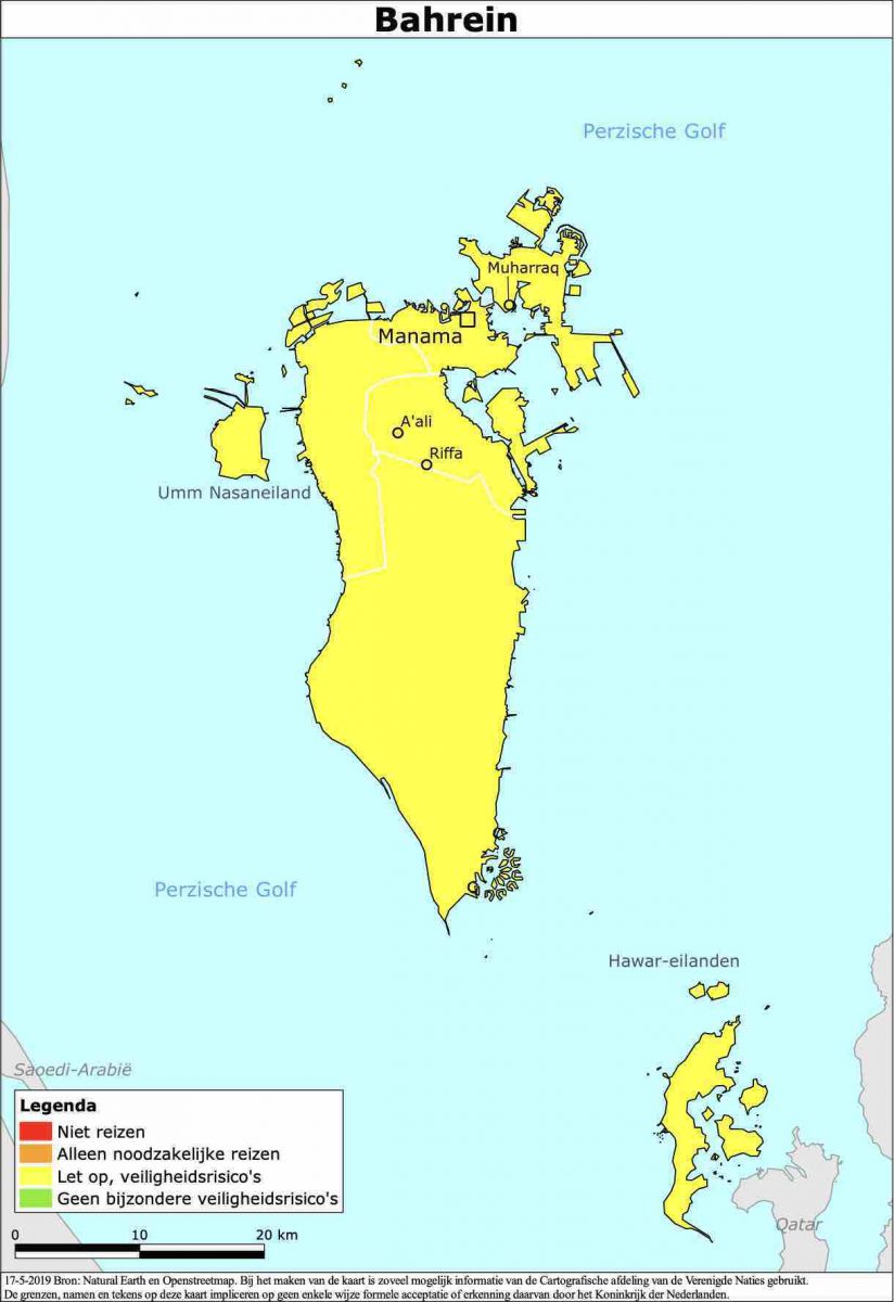 Het Ministerie van Buitenlandse Zaken geeft een reisadvies af voor alle landen ter wereld. Deze adviezen zijn bedoeld om reizigers en toeristen te kunnen vertellen of het in een land veilig is. Ook voor Bahrein is er een reisadvies opgesteld. Op dit moment geldt er geen negatief reisadvies voor Bahrein. Wel moet er bij reizen naar Bahrein rekening worden gehouden met een aantal veiligheidsrisico’s. Bahrein valt daarom ook in de gele categorie: ‘Let op, veiligheidsrisico’s’.